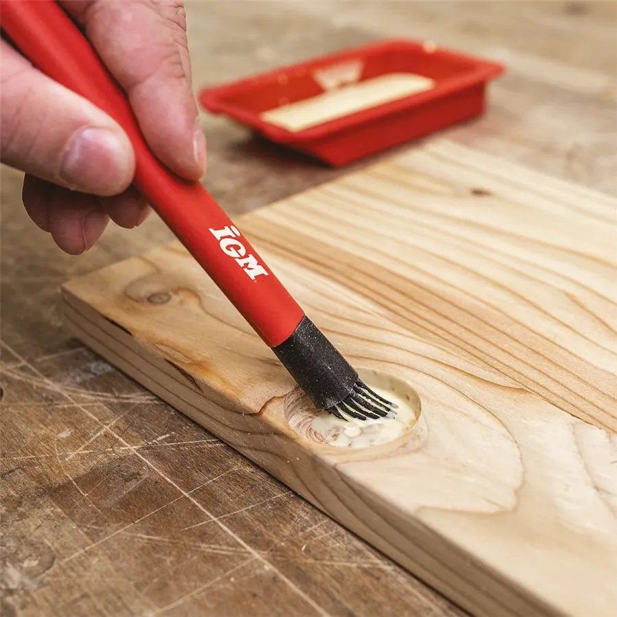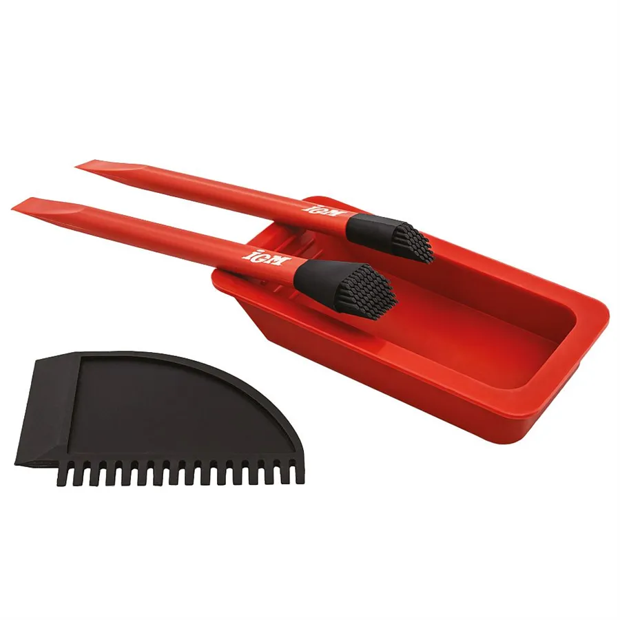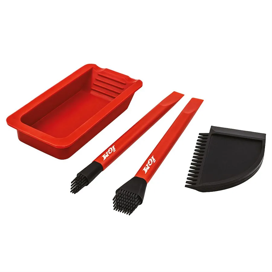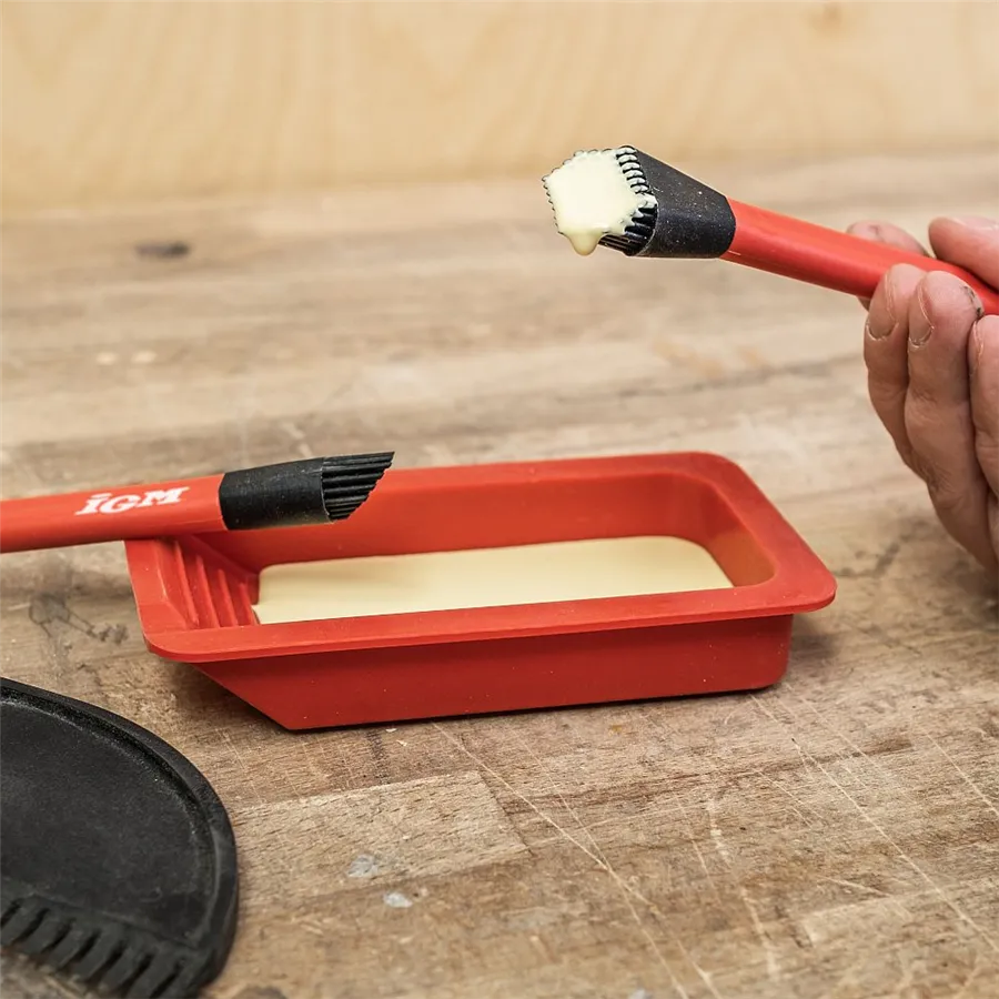 Az IGM szilikon ragasztókészlet két ecsettel (13 és 24 mm széles), szilikon spatulával és tálcával megkönnyíti a ragasztó felvitelét a munkadarabokra. A puha szilikon sörték a feltéten egyenletesen hordják fel a ragasztót keskeny és széles felületeken egyaránt.
